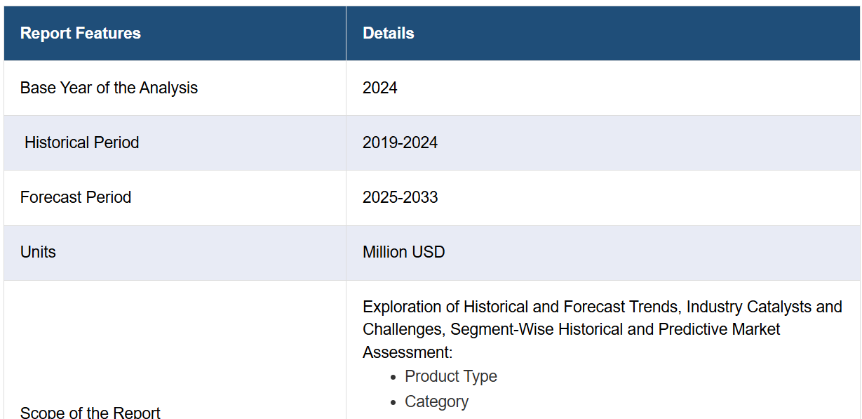 IMARC Group은 시장 각 세분화 분야의 주요 트렌드 분석과 함께 2025-2033년 지역 및 국가별 전망을 제공합니다. 본 보고서는 제품 유형, 카테고리, 가격대, 유통 채널, 최종 사용자 기준으로 시장을 분류했습니다.