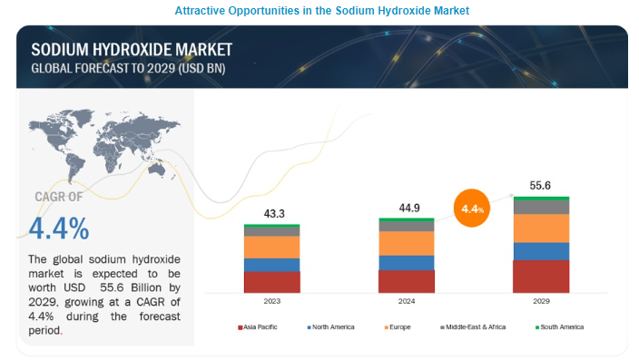 전 세계 수산화나트륨 시장은 2024년 449억 달러 규모이며 2024년부터 2029년까지 연평균 4.4% 성장하여 2029년에는 556억 달러에 달할 것으로 예상됩니다. 전 세계 건설 산업은 주거용 및 비주거용 인프라를 모두 아우르며 크게 성장하고 있습니다. 이러한 건설 활동의 급증은 페인트와 코팅에 대한 수요 증가의 주요 동인 중 하나입니다. 결과적으로 이러한 페인트와 코팅에 대한 수요 증가는 이산화티타늄 시장을 발전시키고 있으며, 이산화티타늄은 이러한 제품에 사용되는 핵심 성분이기 때문입니다. 이는 수산화나트륨 시장에도 긍정적인 영향을 미칩니다. 수산화나트륨은 이산화티타늄 생산에 중요한 역할을 하므로 건설 및 자동차 산업의 호황으로 인한 페인트 및 코팅 부문의 확장은 수산화나트륨 수요를 간접적으로 촉진합니다.