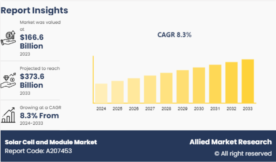 2023년 세계 태양 전지 & 모듈 시장의 가치는 1,666억 달러였으며, 2033년에는 3,736억 달러에 이를 것으로 예상되며, 2024년부터 2033년까지 연평균 8.3%의 성장률을 보일 것으로 예상됩니다.