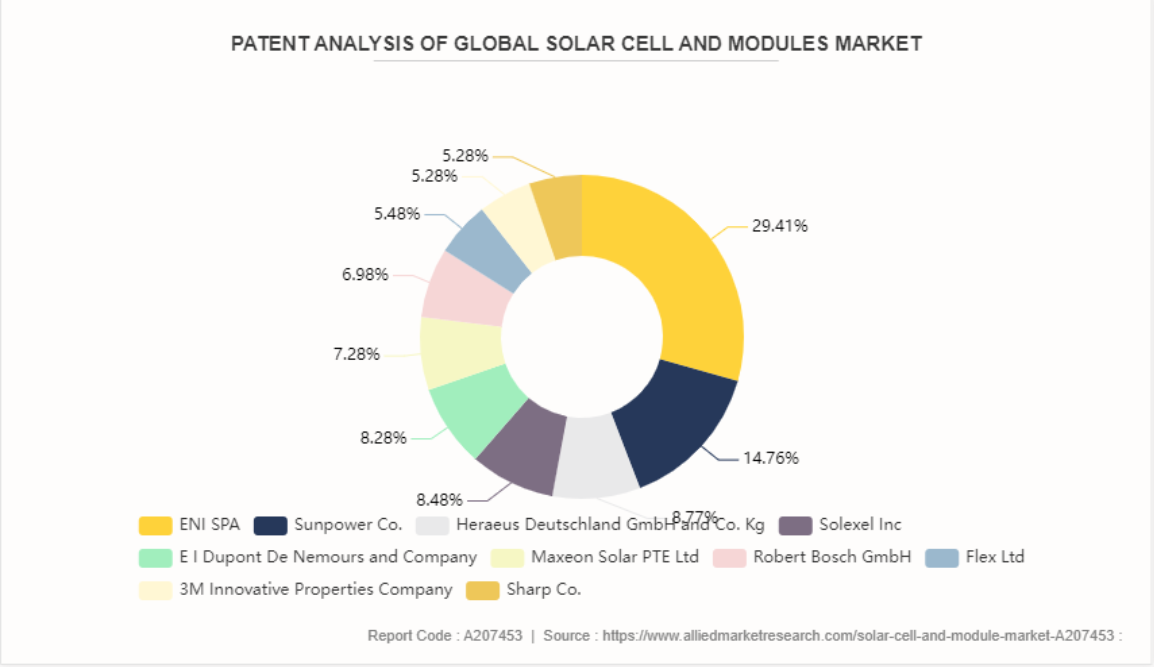 태양 전지 & 모듈 시장의 주요 특허 보유자는 제약 회사, 연구 기관, 대학, 태양 전지 & 모듈 제조업체를 포함합니다. ENI SPA, Sunpower Co., Heraeus Deutschland GmbH 및 Co. Kg, Solexel Inc, E I Dupont De Nemours and Company, Maxeon Solar PTE Ltd, Robert Bosch GmbH, Flex Ltd, 3M Innovative Properties Company, Sharp Co. 등 다양한 태양 전지 & 모듈 생산과 응용에 관한 중요한 특허 포트폴리오를 보유하고 있습니다. 연구 기관과 대학은 새로운 연구 개발과 태양 전지 & 모듈의 사용과 관련된 특허 출원에 기여하고 있습니다.