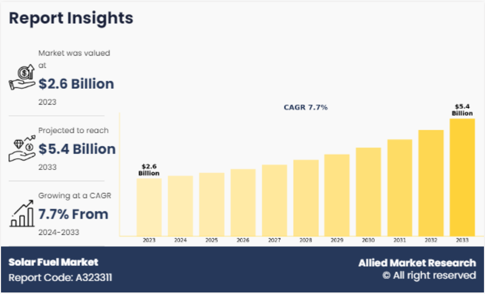 2023년 세계 태양연료 시장의 가치는 26억 달러였으며, 2033년에는 54억 달러에 이를 것으로 예상되며, 2024년부터 2033년까지 연평균 7.7%의 성장률을 보일 것으로 전망됩니다. 글로벌 태양연료 시장은 지속가능성의 중요성 증가, 태양에너지 기술의 발전, 녹색 수소 프로젝트에 대한 투자 증가 등 여러 요인으로 인해 성장하고 있습니다. 그러나 높은 초기 투자 비용과 광범위한 인프라의 부족으로 시장 확장이 제한되고 있습니다. 그러나 재생에너지 솔루션에 대한 수요 증가, 녹색 수소 생산으로의 전환, 태양연료 개발에 대한 정부 투자 이니셔티브는 태양연료 시장 성장에 유리한 기회를 제공합니다.