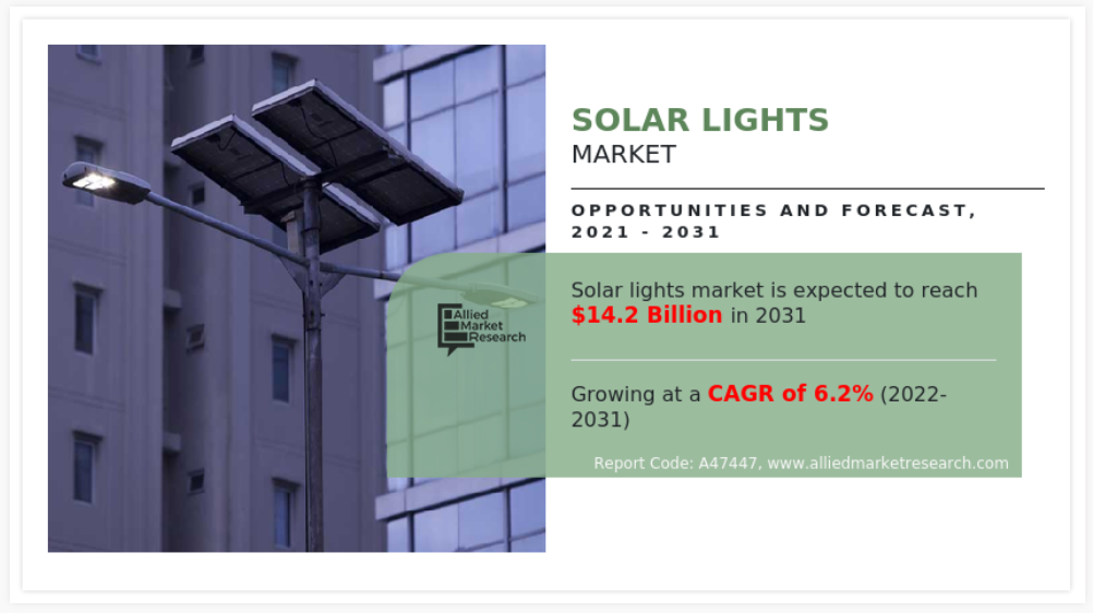 2021년 세계 태양광 조명 시장의 가치는 81억 달러였으며, 2031년에는 142억 달러에 이를 것으로 예상되며, 2022년부터 2031년까지 연평균 6.2%의 성장률을 보일 것으로 예상됩니다.