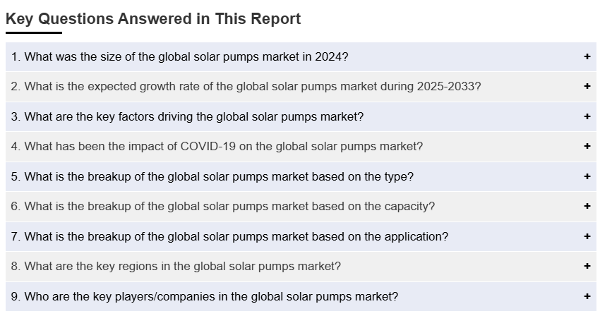 농업 부문의 상당한 발전과 더불어, 작물 관개와 지역사회 물 공급을 위한 물 관리 공급 솔루션에 대한 필요성이 증가하는 것이 시장 성장을 이끄는 주요 요인들 중 하나입니다. 또한, 환경에 대한 우려가 커지고 재생 불가능한 자원을 사용하는 데 따른 해로운 영향에 대한 소비자의 인식이 높아짐에 따라 시장 성장에 따른 제품 수요가 촉진되고 있습니다. 이는 정부가 석탄, 디젤과 같은 화석 연료에 대한 의존도를 최소화하고 온실가스(GHG) 배출을 줄이기 위해 엄격한 녹색 규제를 시행한 데 따른 것입니다. 또한, 소비자의 친환경 재생 에너지에 대한 선호도가 높아짐에 따라 규제 기관은 여러 산업 및 주거 인프라 전반에 걸쳐 태양 에너지 사용을 장려하고 있으며, 이는 또 다른 성장 요인으로 작용하고 있습니다. 이와 더불어, 농촌 지역의 전기화 증가와 깊은 우물 배관 및 가축 급수 시설에 필요한 연료 수요가 증가함에 따라, 최소한의 낭비를 보장하면서 저수지에서 물을 끌어올 수 있는 태양열 펌프의 사용이 원격 지역에서 증가하고 있습니다. 이는 시장 성장에 기여하고 있습니다. 전략적 협력을 통해 주요 업체들이 최근에 개발한 첨단 태양열 펌프와 그 이점에 대한 인식 증가와 같은 다른 요인들도 시장에 긍정적인 전망을 만들어 내고 있습니다.