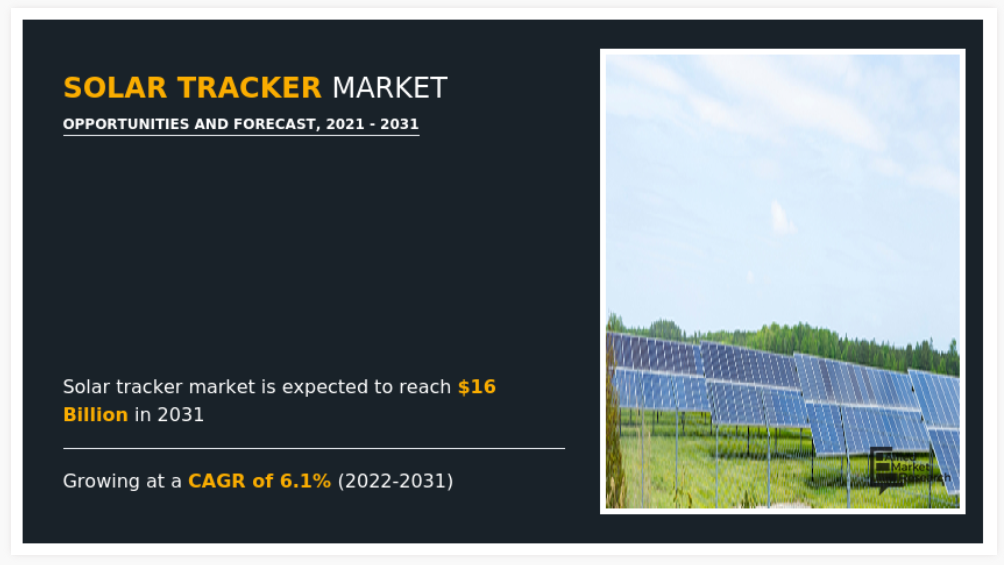 2021년 세계 태양광 추적기 시장 규모는 89억 달러였으며, 2031년에는 160억 달러에 이를 것으로 예상되며, 2022년부터 2031년까지 연평균 성장률(CAGR) 6.1%로 성장할 것으로 전망됩니다.