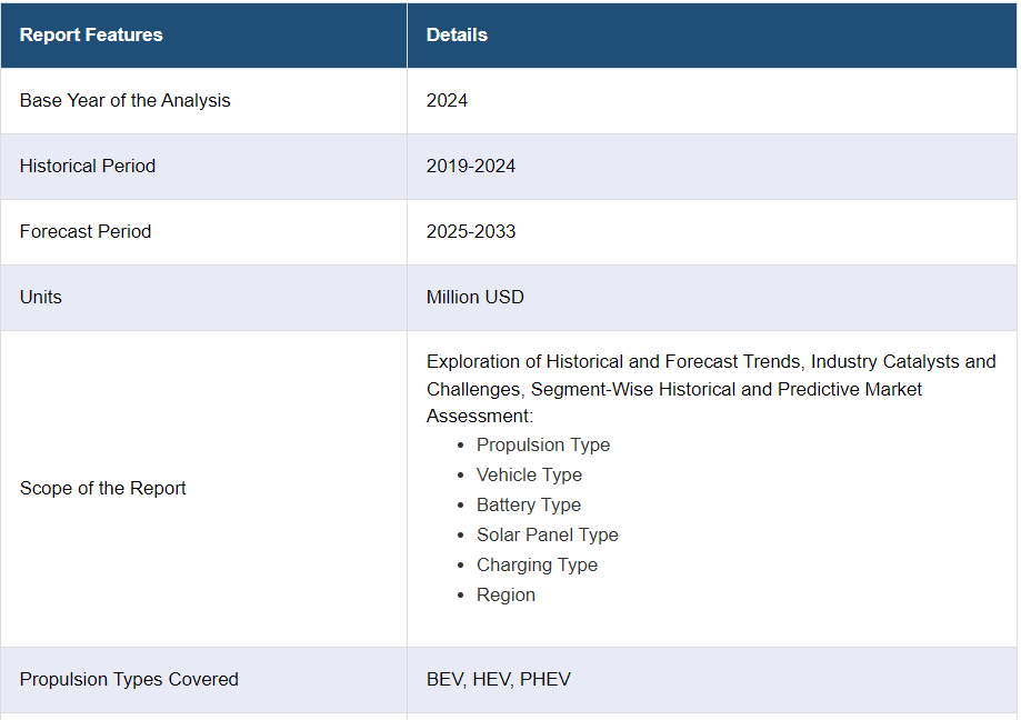 IMARC 그룹은 2025-2033년 글로벌, 지역 및 국가 수준에서의 예측과 함께 글로벌 태양광 자동차 시장 보고서의 각 부문별 주요 동향에 대한 분석을 제공합니다. 이 보고서는 추진 유형, 차량 유형, 배터리 유형, 태양 전지판 유형 및 충전 유형에 따라 시장을 분류했습니다.