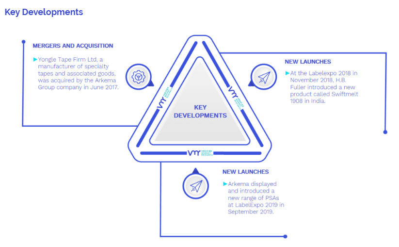 • Arkema는 2019년 9월 LabelExpo 2019에서 새로운 범위의 PSA를 전시하고 소개했습니다. 포장, 건설, 자동차 부문에서 이러한 접착제에 대한 수요 증가를 충족하기 위해 새로운 라인은 향상된 성능과 지속 가능성을 갖춘 솔루션으로 구성되었습니다.