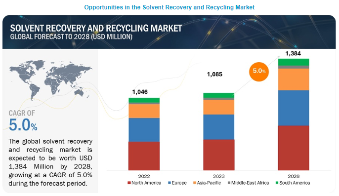 용제 회수 및 재활용 시장 규모는 2023년 1,085백만 달러로 평가되었으며 2028년에는 1,384백만 달러에 달할 것으로 예상되며, 2023년부터 2028년까지 5.0%의 연평균 성장률을 보일 것으로 전망됩니다. 용매 회수 및 재활용에는 제조 과정에서 발생하는 폐기물이나 부산물 용매에서 유용한 물질을 추출하여 재사용하는 과정이 포함됩니다. 이 프로세스는 폐기물 감소의 한 형태이며 폐기물 발생을 줄이고 새로운 용매를 생산할 필요성을 최소화하기 위해 널리 사용됩니다. 용매 회수는 일반적으로 다단계 증류 공정을 사용하여 끓는점보다 낮은 온도에서 용매를 구성 성분으로 분리하여 원용매 제품과 거의 구별할 수 없는 용매를 회수합니다. 이렇게 회수된 용매는 용도를 변경하여 새로운 용매를 생산할 필요성을 줄이고 대량의 폐기물을 제거하는 동시에 환경으로부터 잠재적으로 유해한 물질을 제거할 수 있습니다.