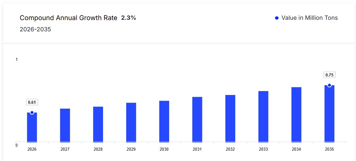 2026-2035년 예측 기간 동안 시장은 건실한 성장을 보이며 2035년까지 75만 톤에 이를 것으로 추정됩니다.