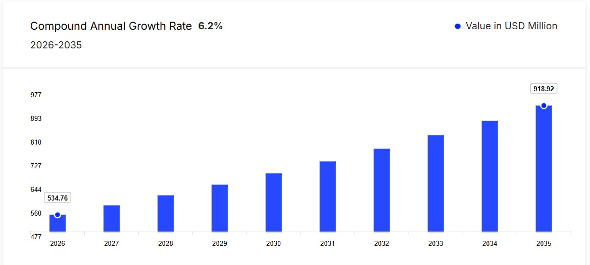 2026-2035년 예측 기간 동안 시장은 건실한 성장을 보이며 2035년까지 9억 1,892만 달러에 도달할 것으로 추정됩니다.