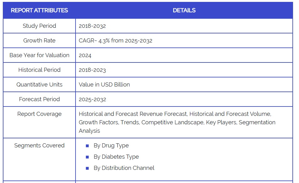 제1형 및 진행성 제2형 당뇨병에 대한 인슐린 수요 증가로 장시간 작용형 및 초속효성 제형이 부상하고 있습니다. 한국의 바이오 제약 산업은 국내 생산을 늘리는 한편, CGM 및 원격의료와 같은 디지털 헬스 도구는 치료 순응도를 촉진합니다. 한국 당뇨병 치료제 시장에서 제1형 및 진행성 제2형 당뇨병에 대한 인슐린 수요가 증가함에 따라 시장은 2025년부터 2032년까지 연평균 4.3%의 성장률을 보일 것으로 예상됩니다.