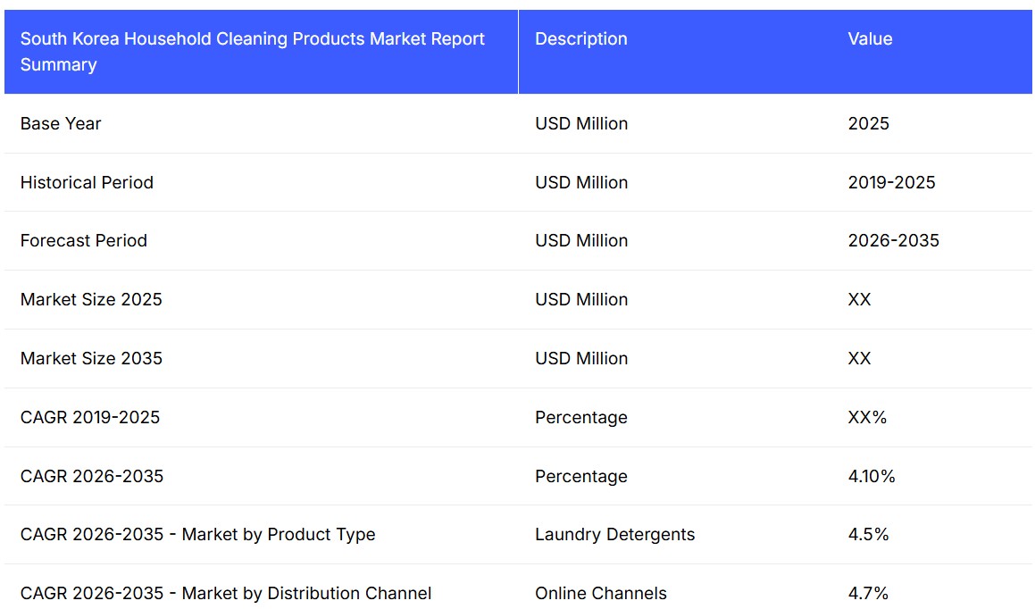 한국 가정용 청소용품 시장은 2026년부터 2035년까지 연평균 복합 성장률(CAGR) 4.10%로 성장할 것으로 전망됩니다.