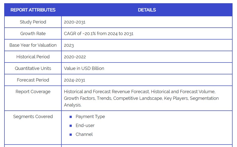 결제 시스템의 기술 혁신, 스마트폰 보급률 증가, 비접촉 결제 채택 확대 등으로 시장이 급속히 확장되고 있습니다. 보안 규정 준수를 유지하면서 디지털 결제 솔루션에 대한 수요가 증가함에 따라 시장은 2024년부터 2031년까지 연평균 복합 성장률(CAGR) 20.1%로 성장할 전망입니다.