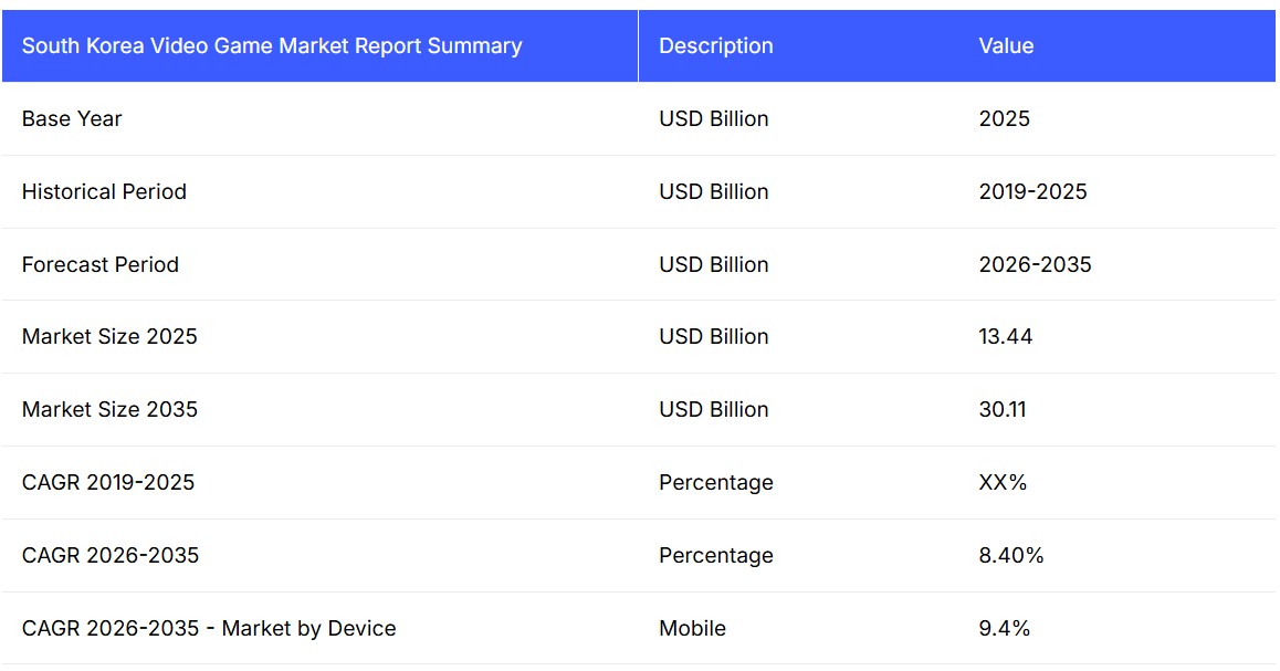 한국 비디오 게임 시장은 2026년부터 2035년까지 연평균 8.40%의 성장률을 보일 것으로 예상됩니다.