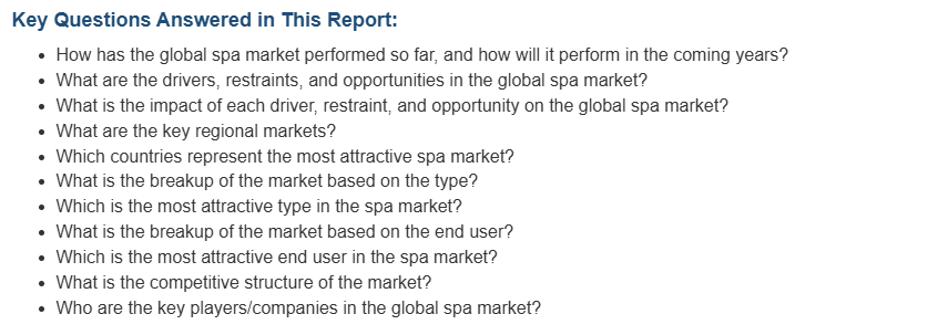 시장에서 주요 업체들은 웰빙과 휴식 경험에 대한 증가하는 수요를 활용하기 위해 여러 가지 전략적 이니셔티브에 적극적으로 참여하고 있습니다. 이러한 업계 리더들은 다양한 고객 선호도를 충족시키기 위해 새로운 맞춤형 트리트먼트를 도입하면서 스파 서비스를 지속적으로 혁신하고 있습니다. 또한 럭셔리 리조트, 도심, 심지어는 크루즈선 등 전략적 위치에 스파 시설을 개설하여 더 많은 웰빙 애호가들에게 다가가는 등 그 영역을 확장하고 있습니다. 또한, 많은 스파 업체들이 예약과 고객 경험을 향상시키기 위해 디지털 기술을 도입하고 있으며, 온라인 예약, 개인 맞춤형 웰니스 플랜, 가상 상담 등을 제공하고 있습니다. 지속 가능성도 중요한 관심사입니다. 환경 친화적인 관행과 제품을 스파 운영에 도입하려는 노력과 함께, 환경에 책임 있는 웰니스 경험을 추구하는 친환경 소비자의 증가 추세에 발맞추고 있습니다.