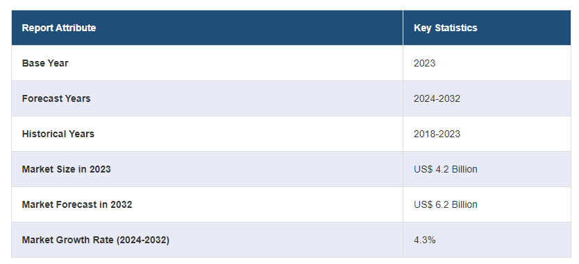 전 세계 점화 플러그 시장은 2023년에 42억 달러 규모에 달하며, 2024년부터 2032년까지 연평균 4.3% 성장하여 2032년에는 62억 달러에 이를 것으로 예상됩니다. 자동차 생산 증가, 기술 발전, 정부의 우호적인 정책, 소비자의 유지 관리 인식 증가, 항공 부문에서의 활용 등이 주요 성장 요인으로 작용하고 있습니다. 점화 플러그는 내연 엔진의 필수 전기 부품으로, 구리, 이리듐, 백금 등 다양한 재료로 제작됩니다. 이들은 연비 향상, 엔진 성능 개선, 배기가스 감소 등의 이점을 제공합니다.