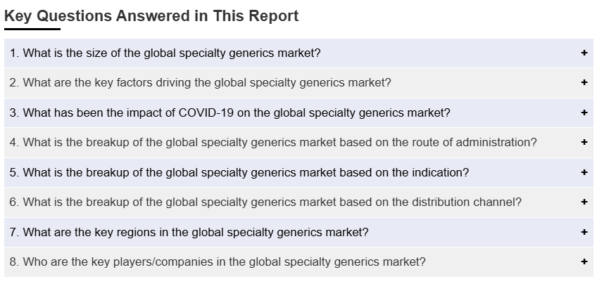 시장 조사 보고서는 또한 시장의 경쟁 구도에 대한 포괄적인 분석을 제공했습니다. 모든 주요 기업의 상세한 프로필도 제공되었습니다. 전문 제네릭 산업의 주요 시장 참여자 중 일부는 Teva Pharmaceuticals Industries, Akorn, Inc., Mylan N.V., Mallinckrodt, Sandoz International GmbH, Pfizer, Inc., Sun Pharmaceutical Industries Ltd., Valeant Pharmaceuticals, Apotex Corp. 및 Endo International plc를 포함합니다.