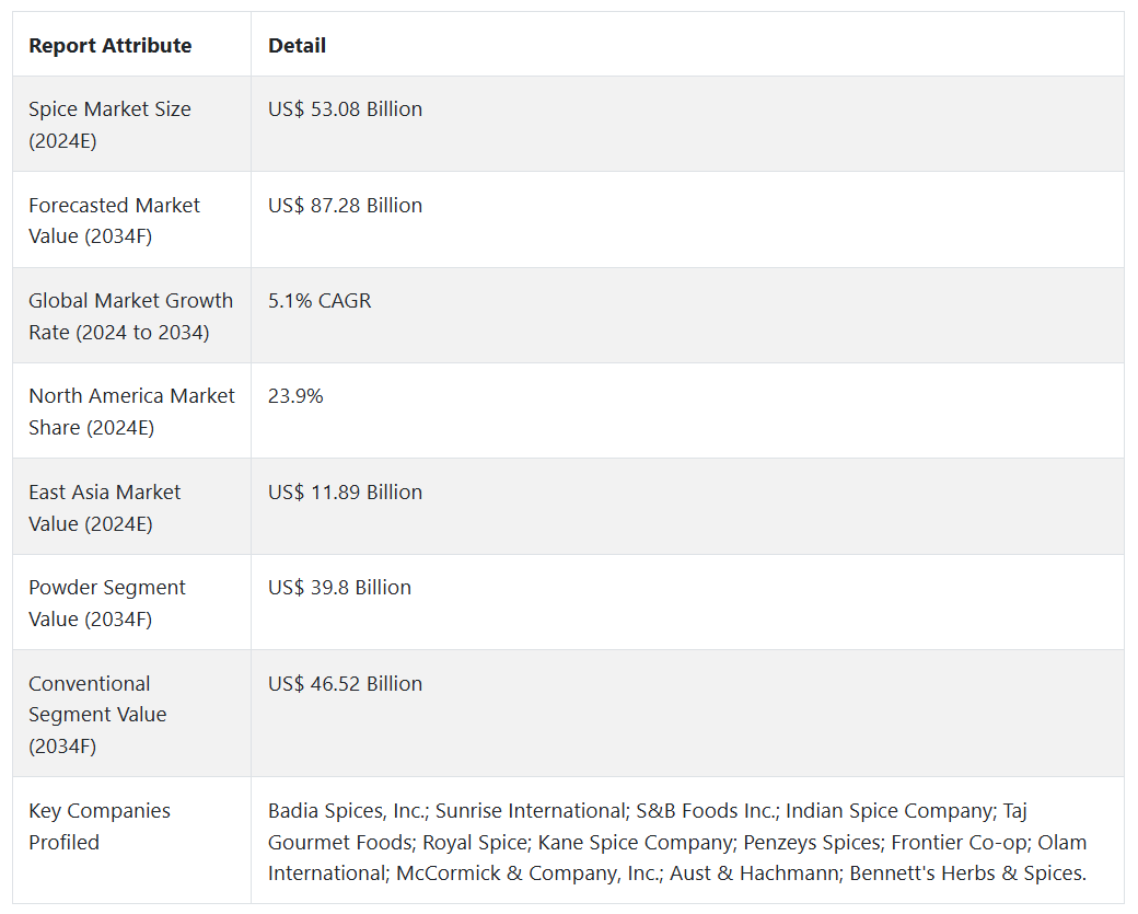 Fact.MR이 발표한 새로운 산업 보고서에 따르면, 2024년 전 세계 향신료 시장의 매출액은 미화 530억 8천만 달러로 분석되었으며, 2034년 말까지 연평균 5.1%의 성장률로 확대되어 미화 872억 8천만 달러에 이를 것으로 예상됩니다.