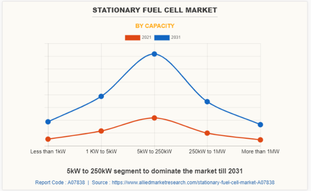 용량에 따라 5KW에서 250KW까지의 세그먼트가 2021년 고정형 연료 전지 시장 점유율의 42.0%를 차지했으며, 예측 기간 동안 그 우위를 유지할 것으로 예상됩니다. 이는 화학, 석유 등 대규모 산업에서 광범위하게 사용되기 때문입니다. 고정형 연료 전지는 과잉 증기가 미래의 전력 생산을 위해 수소 연료를 저장하는 연료 전지를 통과하기 때문에 열병합 발전 분야에서 널리 사용됩니다.
