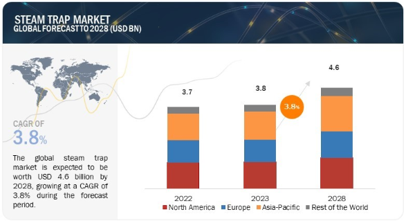 글로벌 스팀 트랩 시장 규모는 2023년 38억 달러에서 2028년 46억 달러로 예측 기간 동안 3.8%의 연평균 성장률(CAGR)로 성장할 것으로 예상됩니다. 이러한 시장 성장은 에너지 효율적인 스팀 시스템에 대한 수요 증가와 신흥 경제국의 빠른 경제 성장이 스팀 트랩 시장에 기회를 제공하는 등의 요인에 의해 주도되고 있습니다. 그러나 스팀 트랩 시스템에 대한 인식 부족과 이점은 시장 성장에 도전하고 있습니다.