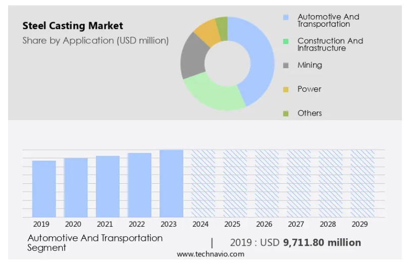 글로벌 철강 주조 시장 : 적용 분야 (자동차 및 운송, 건설 및 인프라, 광업, 전력, 기타), 한국, 아시아, 미국, 2025-2029, 시장 규모