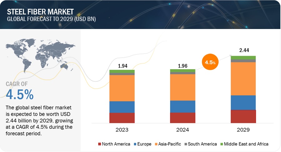 철강 섬유 시장은 2024년 19억 6,000만 달러로 평가되었으며 2024년부터 2029년까지 연평균 4.5% 성장하여 2029년에는 24억 4,000만 달러에 달할 것으로 예상됩니다. 아시아 태평양, 중동 및 아프리카 전역에서 건설 및 인프라 개발이 증가함에 따라 강철 섬유에 대한 수요가 증가하고 있습니다.