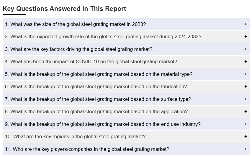 IMARC 그룹은 2024-2032년 기간 동안의 글로벌, 지역, 국가 수준에서의 예측과 함께, 글로벌 스틸 그레이팅 시장 보고서에서 각 부문의 주요 트렌드에 대한 분석을 제공합니다. 저희 보고서는 재료 유형, 제작, 표면 유형, 응용 분야, 최종 사용 산업을 기준으로 시장을 분류했습니다.