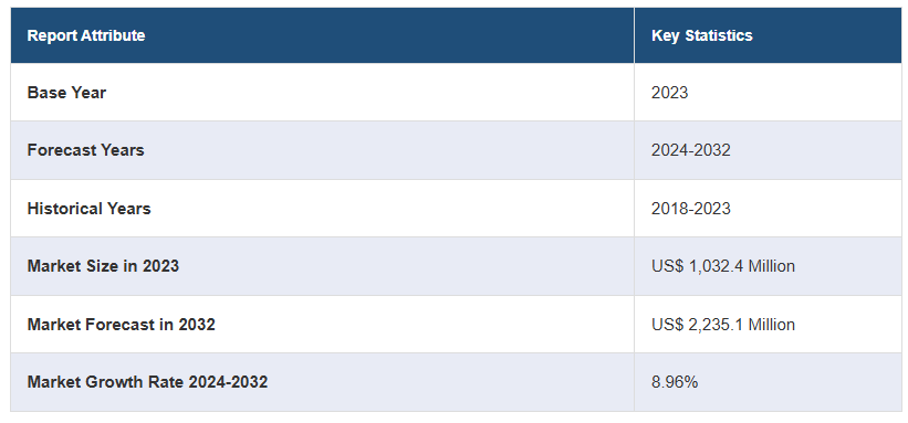 글로벌 무균 테스트 시장 규모는 2023년 미화 1,032.4백만 달러에 달했습니다. 앞으로 IMARC 그룹은 2024-2032년 동안 8.96%의 성장률(CAGR)을 보이며 2032년까지 시장이 미화 2,235.1백만 달러에 이를 것으로 예상하고 있습니다. 제약 산업의 상당한 성장, 의료 기기 제조에서 증가하는 테스트 수요, 최근 개발 된 신속한 미생물 검출 시스템은 시장을 이끄는 주요 요인 중 일부를 나타냅니다.