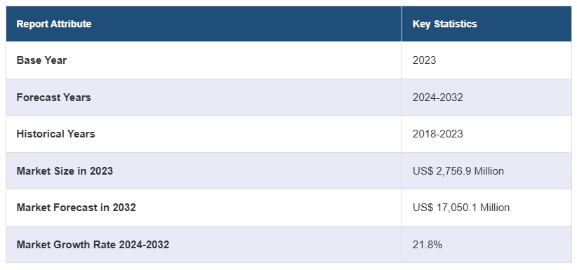 전 세계 신축성 전도성 소재 시장은 2023년에 약 2,756.9백만 달러의 규모를 기록하며, 2024년부터 2032년까지 연평균 성장률(CAGR) 21.8%를 기록할 것으로 예상되고 있습니다. 2032년에는 시장 규모가 17,050.1백만 달러에 이를 것으로 전망됩니다. 신축성 전도성 소재는 전기 장치의 인공 근육에 전력을 공급하는 역할을 하는 기계적 신축성을 가진 자가 치유 소재입니다. 주요 소재로는 그래핀, 은, 구리, 탄소 나노튜브가 있으며, 이들은 전도성이 있는 필러를 사용하거나 유연한 기판에 전도성 소재를 증착하여 제작됩니다.