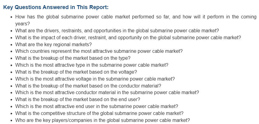 현재, 급속한 도시화로 인해 증가하는 전력 수요가 시장의 성장을 강화하고 있습니다. 또한, 전 세계적으로 해상 풍력 발전 단지의 수가 증가함에 따라 해저 전력 케이블에 대한 수요가 증가하고 있어 긍정적인 시장 전망을 제공합니다. 또한, 전 세계적으로 전력 수요가 최고조에 달하는 동안 전력망의 안정성과 보안에 대한 관심이 높아짐에 따라 시장이 성장하고 있습니다. 이 외에도, 신뢰성이 향상된 국경을 초월한 상호 연결 전력망 연결에 대한 수요가 증가하면서 업계 종사자들에게 유리한 성장 기회를 제공하고 있습니다. 또한, 전 세계적으로 번창하는 해양 석유 및 가스 산업으로 인해 해저 전력 케이블의 채택이 증가하면서 시장 성장에 도움이 되고 있습니다.