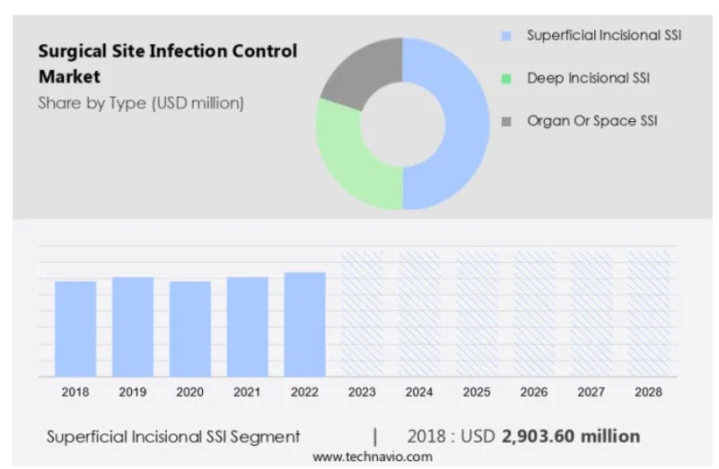 표재성 절개 SSI 부문은 예측 기간 동안 상당한 성장을 보일 것으로 추정됩니다. 의료 산업에서 표재성 절개 SSI(수술 부위 감염)는 특히 미국에서 중요한 관심사입니다. 이러한 감염은 수술 후 상처 부위에서 발생할 수 있으며 고름 형성을 유발할 수 있습니다. 표재성 절개부위 감염(SSSI)을 예방하기 위해 수술 후 30일 동안 의무적으로 감시를 실시합니다.