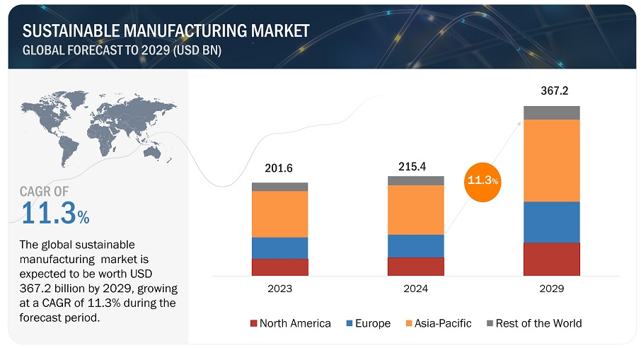 전 세계 지속 가능한 제조 시장은 2024년 2,214억 달러로 평가되었으며 2029년에는 3,672억 달러에 달할 것으로 예상되어 예측 기간 동안 11.3%의 CAGR을 기록할 것으로 전망됩니다. 지속 가능한 제조 시장은 규제 요건, 소비자 수요, 기술 발전 및 경제적 인센티브로 인해 빠르게 확장되고 있습니다. 제조업체는 프로세스를 자동화하고 제품을 개인화하며 자원을 효율적으로 사용하여 생산 효율성을 높이고 폐기물 감소, 에너지 효율성 및 재활용과 같은 관행을 구현합니다.