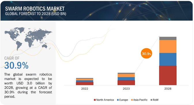 스웜 로보틱스 시장 규모는 2023년 0.8억 달러에서 2028년 30억 달러로 성장하여 예측 기간 동안 30.9%의 CAGR을 기록할 것으로 예상됩니다. 창고에서 스웜 로봇의 사용 증가, 인공 지능 및 머신 러닝과 같은 신기술 개발, 군사 부문에서 스웜 기반 드론의 채택 증가가 향후 5년 동안 시장을 촉진할 것으로 예상됩니다. 그러나 군집 지능에 대한 낮은 인식, 주요 산업의 신기술 수용 꺼려, 숙련된 인력 부족은 업계 플레이어들에게 도전 과제가 될 것으로 보입니다.