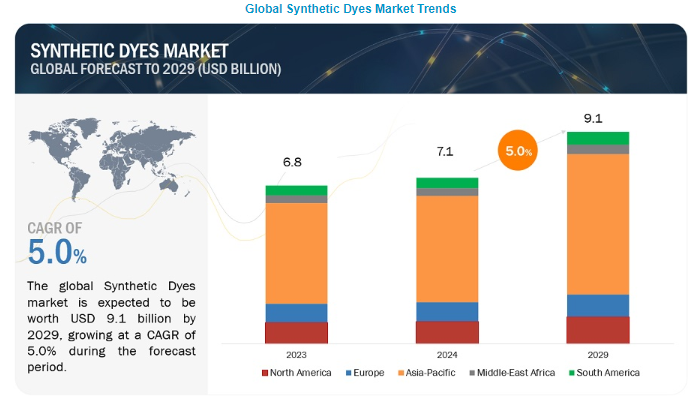 전 세계 합성 염료 시장은 2024년 71억 달러 규모이며 2024년부터 2029년까지 5.0%의 연평균 성장률로 2029년에는 91억 달러에 이를 것으로 예상됩니다.