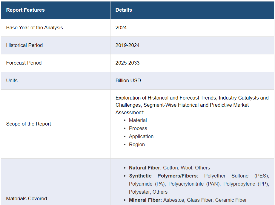 현재 급속한 도시화, 전 세계 인구 증가, 주거 및 상업 부문에서의 건설 및 리모델링 활동 증가는 시장 성장을 촉진하는 주요 요인 중 하나입니다. 또한 자동차 산업이 크게 성장하고 최적의 연비를 갖춘 경량 차량 제조에 기능성 섬유가 광범위하게 채택되면서 제조업체에게 수익성 높은 기회를 제공하고 있습니다. 테크니컬 텍스타일은 공기 및 오일 필터, 카펫, 배터리 분리기 등 자동차의 수많은 부품 제조에 사용됩니다. 이와 함께 하이브리드 및 전기 자동차(H/EV)의 판매 증가는 전 세계적으로 제품 수요를 견인하고 있습니다. 이 외에도 전 세계적으로 병원 및 의료 센터의 확장과 함께 일회용 의료복이 증가하면서 시장 성장에 기여하고 있습니다. 또한 더욱 향상된 기능을 갖춘 혁신적인 기술 섬유 개발을 위해 섬유 제조 절차에 첨단 기술을 통합하는 것이 시장 성장에 유리하게 작용하고 있습니다. 또한 건설 현장 사고의 증가와 여러 전염병의 유병률 증가로 인해 개인 보호 장비(PPE)에 대한 수요가 촉발되고 있어 시장 전망이 우호적입니다. 또한 환경에 대한 관심이 높아지면서 산업 전반에 걸쳐 지속 가능하고 친환경적인 기술 섬유에 대한 수요가 증가하고 있습니다. 이 외에도 스포츠에 대한 개인의 참여가 증가함에 따라 제품 활용도가 확대되고 있습니다. 또한 시장 범위를 확장하고 전반적인 수익성을 개선하기 위해 전략적 협업 및 인수 합병에 대한 주요 시장 참여자들의 관심이 높아지면서 향후 몇 년 동안 시장 성장이 촉진 될 것으로 예상됩니다.