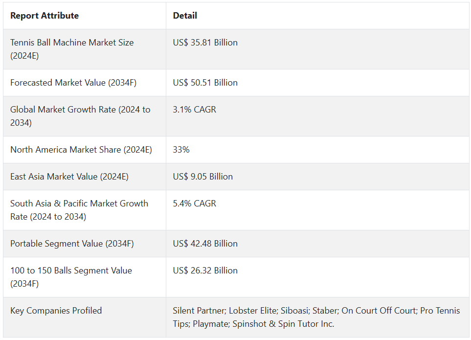 전 세계 테니스 공 기계 시장은 2024년에 미화 358억 1천만 달러에 달할 것으로 추정됩니다. 이 시장은 2034년 말까지 연평균 3.1% 성장하여 미화 505억 1천만 달러에 이를 것으로 예상됩니다.