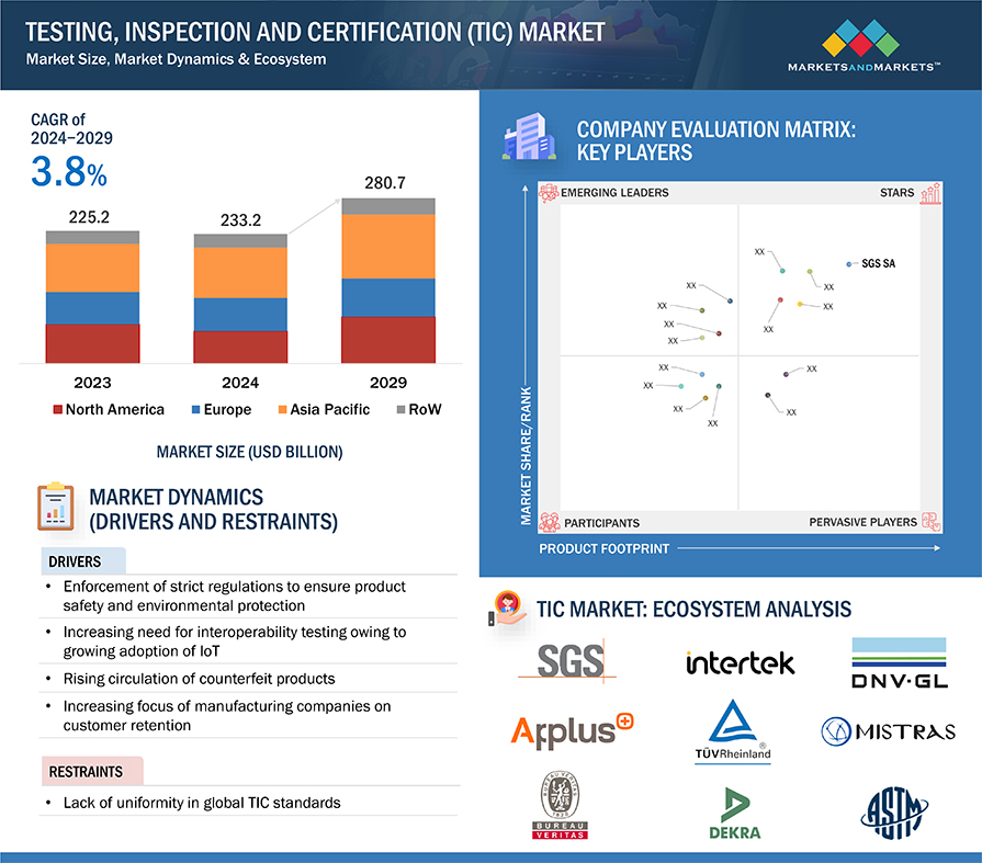 전 세계 테스트, 검사 및 인증(TIC) 시장은 2024년 2,332억 달러에서 2029년 2,806억 달러로 증가하여 이 기간 동안 3.8%의 성장률을 보일 것으로 예상됩니다.