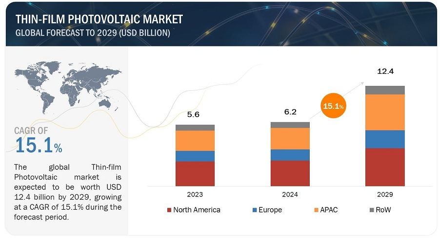박막 태양전지 시장은 2024년 62억 달러에서 2029년 124억 달러로 성장할 것으로 예상되며, 2024년부터 2029년까지 15.1%의 연평균 성장률(CAGR)로 성장할 것으로 전망됩니다. 재생 에너지에 대한 투자 증가는 이 시장을 이끄는 주요 요인 중 하나입니다. 재생 에너지원이 인기를 얻고 있으며, 지난 몇 년 동안 신재생 발전 프로젝트에 대한 투자가 크게 증가했습니다. 태양광 에너지 비용은 이미 중국과 같은 국가에서 소매 전기 가격보다 낮으며, 2024년까지 15~35% 더 하락할 것으로 예상되어 태양광 시스템에 대한 수요를 촉발할 수 있습니다. 이는 정부와 기업 모두 재생 에너지 프로젝트에 자원을 투입할 수 있는 긍정적인 환경을 조성하여 결국 박막 태양전지 시장에 도움이 될 것입니다. 전 세계 여러 정부가 파리 기후 협약과 같은 재생 에너지 비중을 줄이기 위한 노력을 시작하고 있습니다.