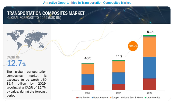 운송용 복합재 시장은 올해 12.7%의 놀라운 연평균 성장률(CAGR)로 발전할 것으로 예상됩니다. 예측에 따르면 2024년 현재 447억 달러 규모인 이 시장은 2029년에는 814억 달러로 성장할 것으로 예상됩니다. 글로벌 기업들이 변화하는 고객의 요구와 규제 요건을 충족하기 위해 경량, 고성능 소재에 대한 관심을 높이면서 운송용 복합재는 다양한 산업 분야에서 선택되는 소재로 점점 더 인정받고 있습니다. 이러한 복합재는 자동차 업계에서 경량화 차량을 설계하여 연비를 개선하고 오염을 줄일 수 있는 가능성을 제시합니다. 마찬가지로 항공우주 분야에서도 항공기 제조업체의 운영 비용 절감 및 연비 개선 노력으로 인해 복합재에 대한 수요가 급증할 것으로 예상됩니다.