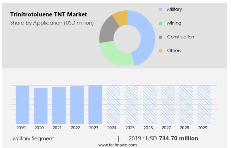 글로벌 트리니트로톨루엔 (TNT) 시장 : 적용 분야 (군사, 광업, 건설, 기타), 한국, 아시아, 미국, 2025-2029, 시장 규모