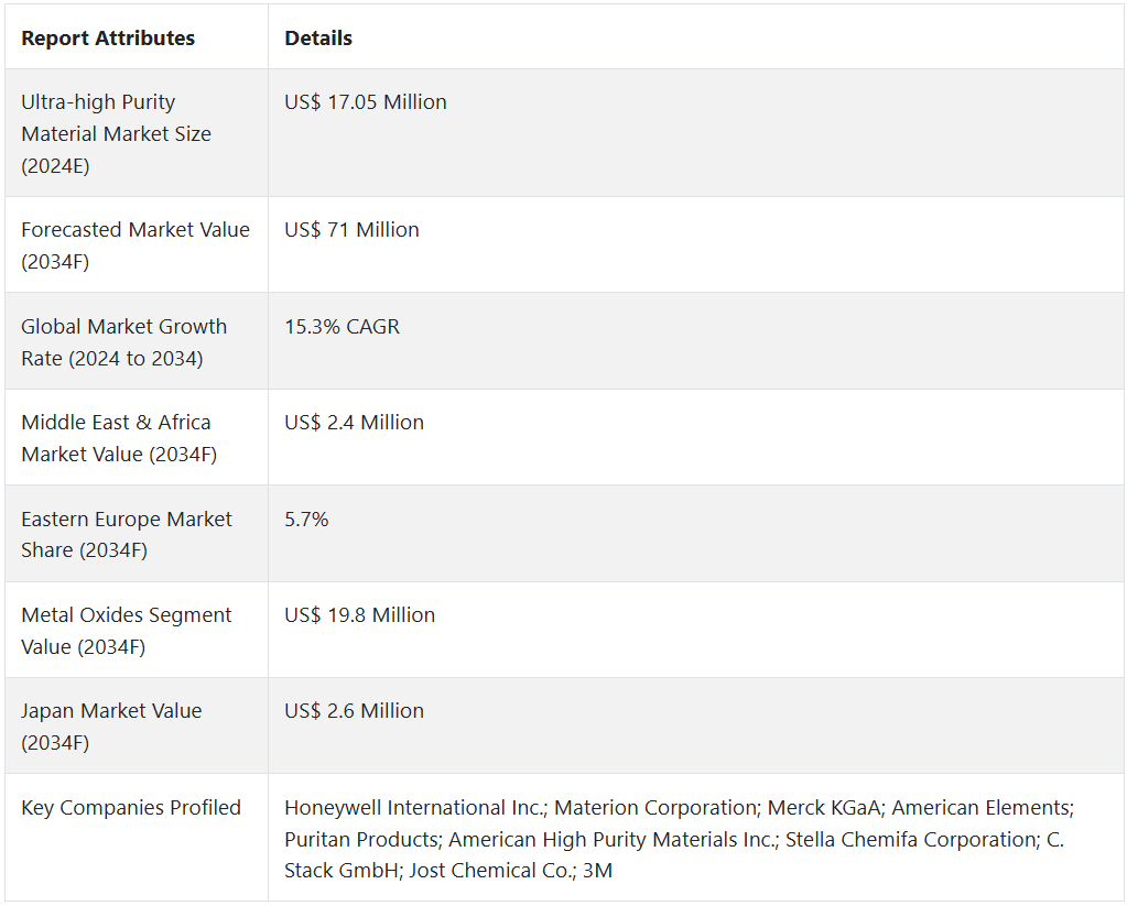 전 세계 초고순도 재료 시장은 2024년에 미화 1,705만 달러의 가치를 지니고 있습니다. 이 시장은 연평균 15.3%의 성장률로 확대되어 2034년에는 미화 7,100만 달러에 이를 것으로 전망됩니다.