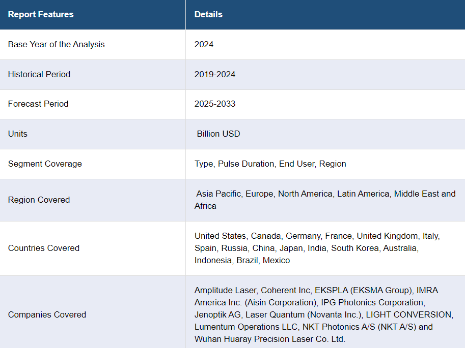 IMARC Group은 2025-2033 년 글로벌, 지역 및 국가 수준의 예측과 함께 글로벌 초고속 레이저 시장 보고서의 각 하위 세그먼트의 주요 동향에 대한 분석을 제공합니다. 이 보고서는 유형, 펄스 지속 시간 및 최종 사용자를 기준으로 시장을 분류했습니다.