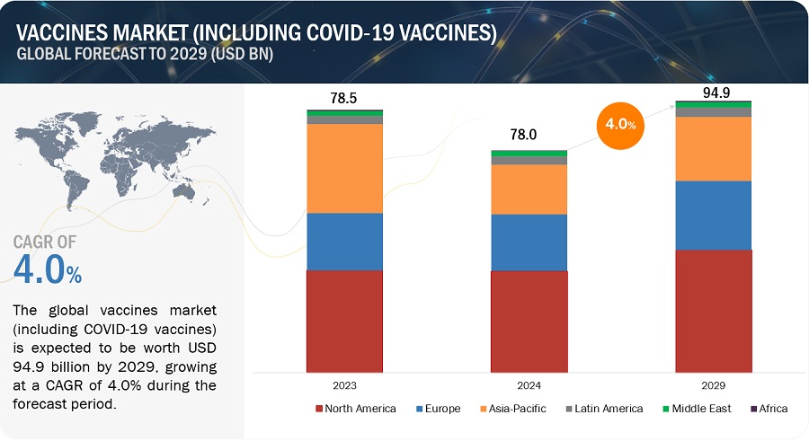 글로벌 백신 시장 성장은 2024년 780억 달러에서 2029년 949억 달러로 4.0%의 연평균 성장률(CAGR)에 힘입어 성장할 것으로 예상됩니다. 마찬가지로 백신 시장(코로나19 백신 제외)은 2024년 530억 달러에서 2029년 803억 달러로 예측 기간 동안 8.7%의 CAGR로 성장할 것으로 예상됩니다. 시장 성장은 새로운 백신의 연구 개발에 대한 투자 증가, RSV 백신의 시장 출시 및 예방 의료에 대한 인식 증가에 의해 촉진됩니다.