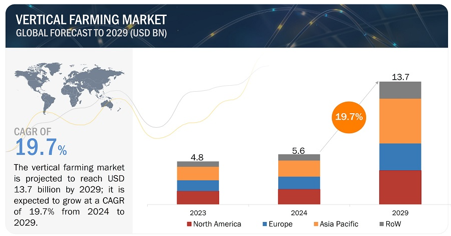 글로벌 수직 농업 시장은 2024년 56억 달러에서 2029년 137억 달러로 성장하여 예측 기간 동안 19.7%의 연평균 성장률을 기록할 것으로 예상됩니다. 수직 농업 시장의 성장을 이끄는 주요 동인은 높은 인구 밀도, 경작지 부족 및 감소, 기후 변화, 환경 파괴와 같은 식량 생산 시스템의 요인입니다. IoT, AI, 수경 재배의 발전은 운영의 효율성과 생산량을 높이는 동시에 신선하고 현지에서 재배된 농산물에 대한 소비자의 관심 증가에 부응하고 있습니다. 또한, 농업에 대한 정부의 지원, 식량 안보의 필요성, 자원 절약은 일종의 회복력 있는 농업으로서 수직 농업 기술의 발전에 더욱 기여하고 있습니다.