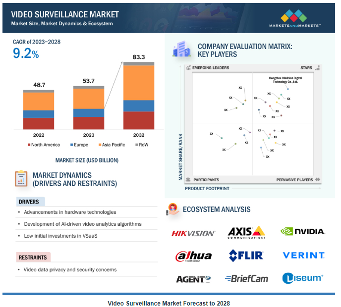 전 세계 비디오 감시 시장은 2023년 537억 달러 규모로 2028년에는 833억 달러에 달할 것으로 예상되며, 2023년부터 2028년까지 9.2%의 연평균 성장률(CAGR)로 성장할 것으로 전망됩니다.