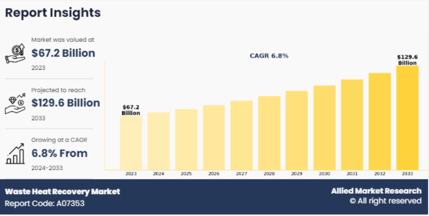 전 세계 폐열 회수 시장 규모는 2023년 672억 달러였으며, 2024년부터 2033년까지 연평균 6.8% 성장하여 2033년에는 1,296억 달러에 달할 것으로 예상됩니다.