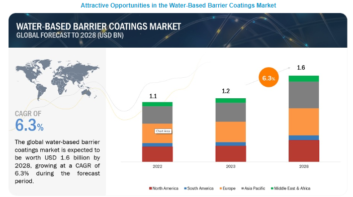 전 세계 수성 차단 코팅 시장 규모는 2023년 12억 달러에서 2028년 16억 달러로 6.3%의 연평균 성장률(CAGR)로 성장할 것으로 예상됩니다. 수성 배리어 코팅은 다양한 기질에 소수성 및 보호 장벽을 구축하는 지속 가능하고 친환경적인 접근 방식을 제공하는 코팅 기술의 핵심입니다. 이러한 코팅은 물, 필러, 첨가제, 바인더로 구성된 세심한 배합으로 이루어집니다. 물은 다른 성분이 분산되는 액체 매질을 생성하는 주 용매 역할을 합니다. 탄산칼슘, 카올린 또는 활석과 같은 원료에서 추출한 필러는 코팅의 성능을 향상하고 적용을 용이하게 하기 위해 통합됩니다. 첨가제는 균일한 분산과 전반적인 기능을 보장하기 위해 소량 포함되며, 바이오 기반 또는 합성 수 분산 라텍스로 만든 바인더는 코팅의 화학 성분의 기초가 되어 차단 특성을 정의합니다.