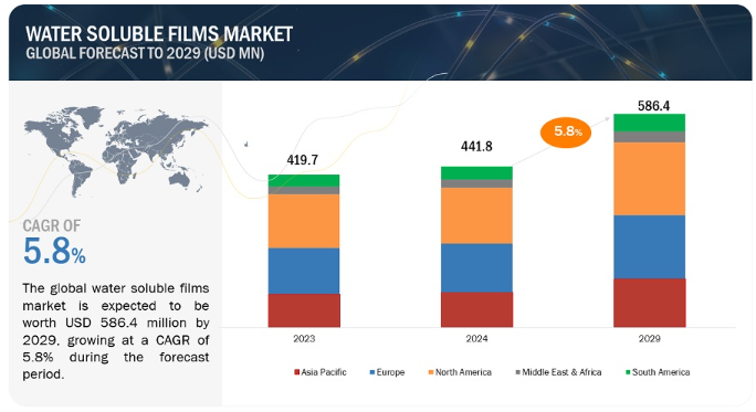 전 세계 수용성 필름 시장은 2024년 4억 4,180만 달러로 평가되며 2024년부터 2029년까지 연평균 5.8% 성장하여 2029년에는 5억 8,640만 달러에 달할 것으로 예상됩니다. 수용성 필름 시장을 긍정적으로 전망하는 주요 이유 중 하나는 지속 가능한 포장에 대한 수요 증가, 소비자 선호도 변화, 편리한 즉석식품에 대한 필요성 때문입니다. 수용성 필름 시장은 규제 요인으로 인해 성장하고 있습니다. 플라스틱 폐기물을 줄이고 생분해성 소재 사용을 장려하기 위해 전 세계적으로 정부 및 규제 기관에서 더 엄격한 법률을 제정하고 있습니다. 따라서 제조업체는 규정을 준수하기 위해 수용성 필름과 같은 환경 친화적인 포장 옵션을 사용해야 합니다. 이러한 요인은 시장의 역동적이고 진화하는 특성에 기여합니다.