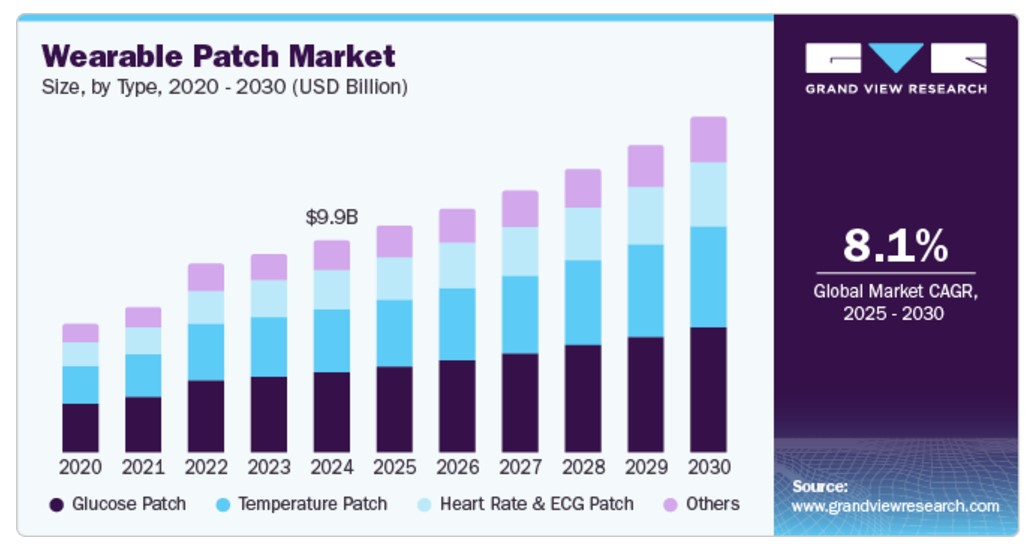 전 세계 웨어러블 패치 시장 규모는 2024년 99억 5,000만 달러로 추정되며 2025년부터 2030년까지 8.1%의 연평균 성장률을 보일 것으로 예상됩니다. 전자 피부 또는 스마트 패치로도 알려진 웨어러블 패치는 질병 모니터링, 진단 및 약물 전달에 사용됩니다. 주로 당뇨병과 같은 만성 질환을 앓고 있는 노인 환자에게 도움이 됩니다. 웨어러블 패치 개발에 대한 R&D 투자가 증가함에 따라 시장은 크게 성장할 것으로 예상됩니다. 스코폴라민, 경피 패치와 같은 웨어러블 패치는 질병 모니터링을 위해 해당 신체 부위에 직접 부착하는 방식입니다. 예를 들어 니코틴 패치는 니코틴 대체 요법(NRT)에 사용되어 체내로 니코틴을 방출하여 흡연을 예방하는 데 도움을 줍니다.