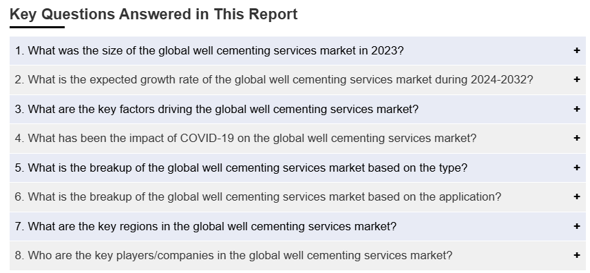 IMARC 그룹은 2024-2032년 기간 동안의 글로벌, 지역, 국가 수준의 예측과 함께, 글로벌 우물 시멘트 서비스 시장 보고서의 각 하위 부문에서 주요 트렌드에 대한 분석을 제공합니다. 저희의 보고서는 유형, 우물 유형, 적용에 따라 시장을 분류했습니다.
