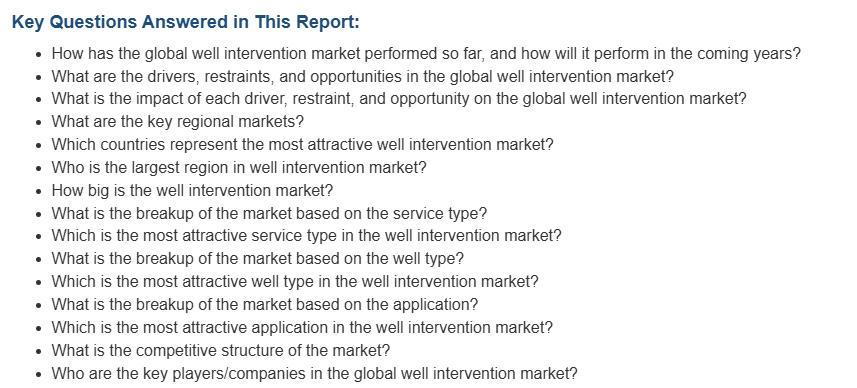 유전 매장량의 석유 및 가스 발견 증가와 유정의 생산량을 증가시킨 주목할 만한 기술 발전의 결과로, 유정 개입 시장이 성장할 것입니다. 미국 알래스카, 이스라엘 골란 고원, 서부 텍사스의 알파인 하이, 틸라피아의 스태브룩 블록, 옐로테일(석유), 랑 레바-1RDR2 탐사 유정에서 발견된 해양 가스 매장지인 하이마라(가스 응축액)는 점점 더 주목을 받고 있는 매장지 중 일부에 불과합니다. 향후 몇 년 동안 유가가 상승할 것으로 예상됩니다. 이는 독립 탐사 회사, 가스 생산 회사, 유전 운영자의 석유 및 가스 발견과 탐사 활동에 대한 투자를 촉진할 것입니다.